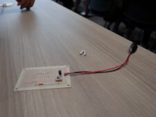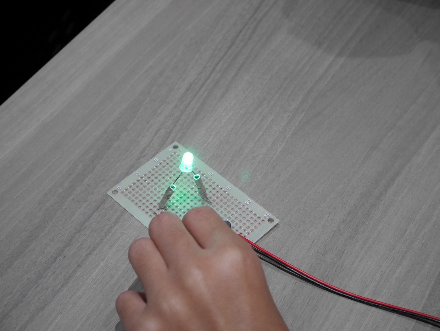 様々な配線をくっつけたり、捻ったりして LEDライトを光らせました
