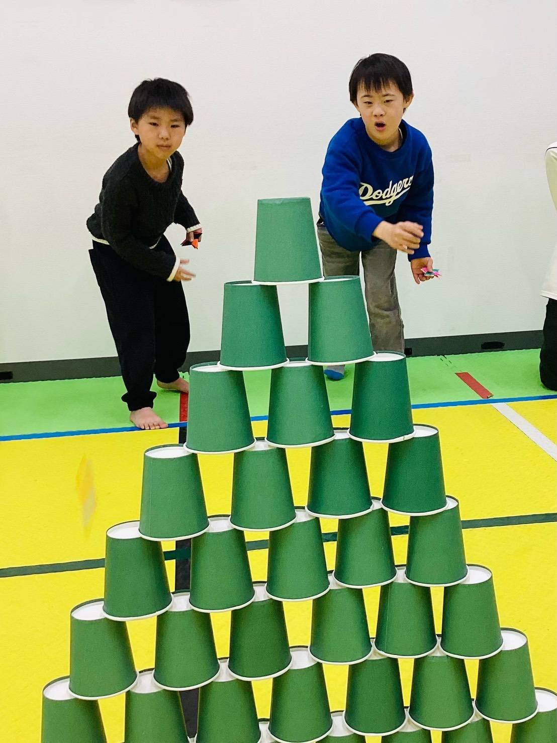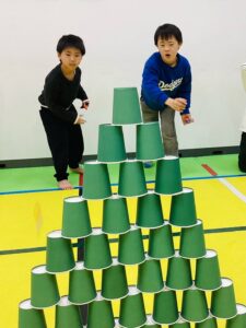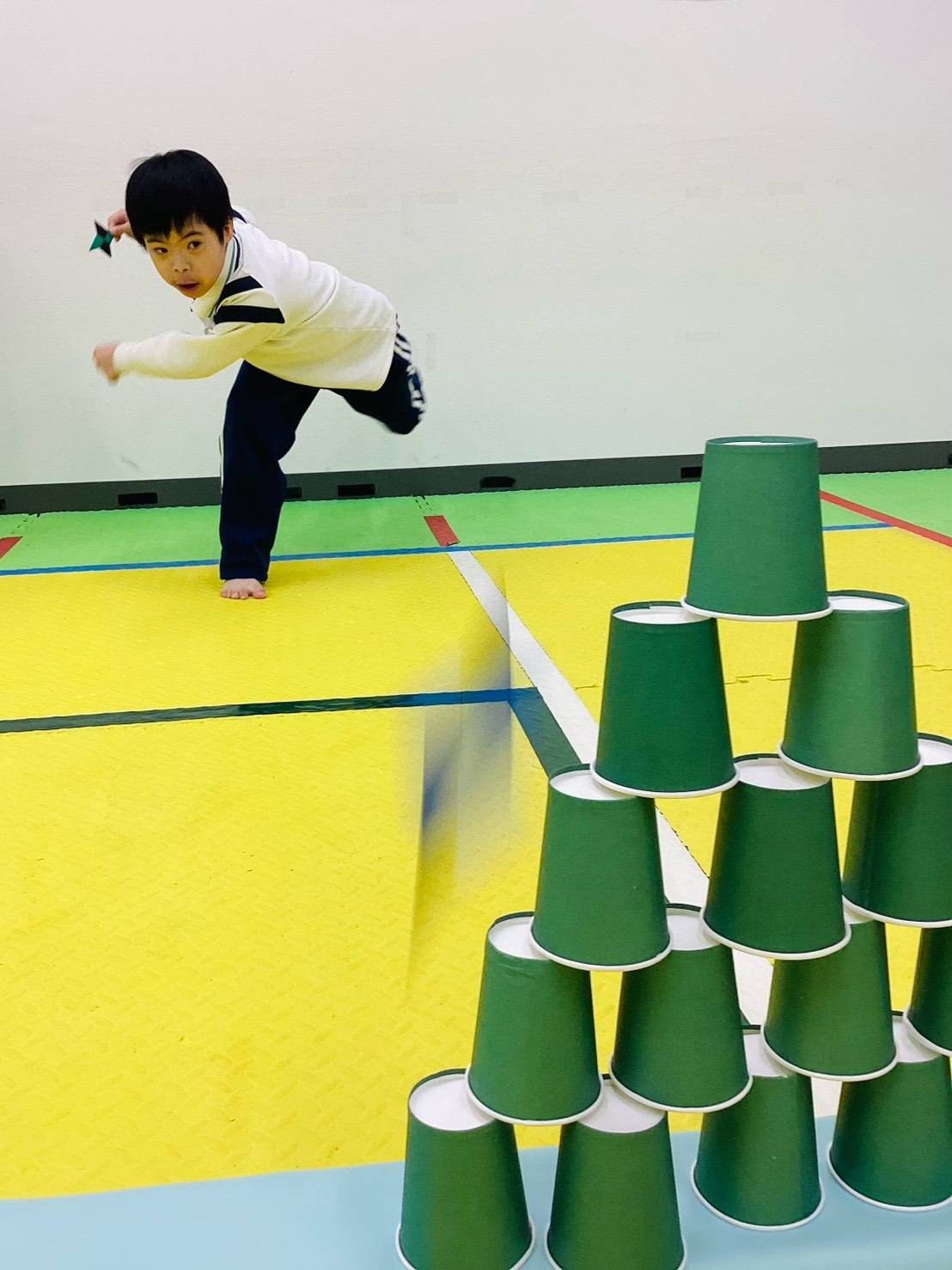 手裏剣の折り方も子ども同士で教え合い、 たくさんの手裏剣が完成! 「遠くにとばすの意外とムズイのに、すげー!」と お友だちを称えたり、 「みんなで紙コップタワー倒そうゼ!」と 盛り上がったり.... カメラを向けると 表情がキリッとする子どもたち。 楽しく身体を動かし、 笑顔あふれるプログラムとなりました