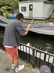 子どもたちは エサを慎重に釣竿につけて 狙いを定めて投げます