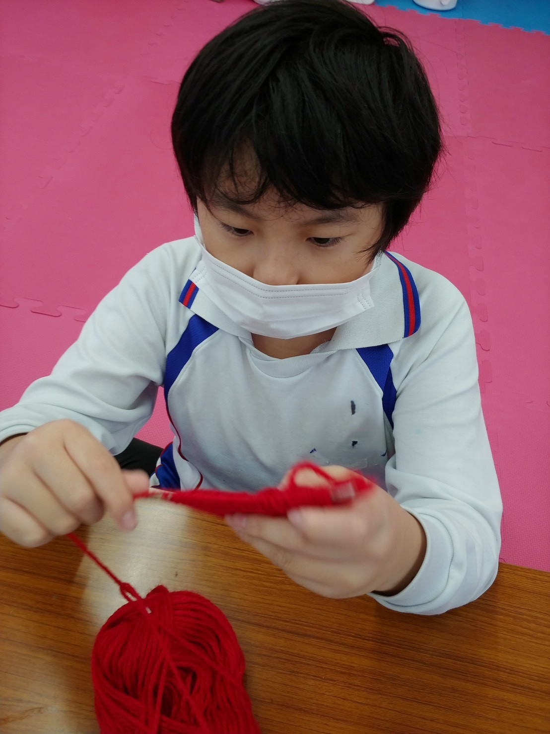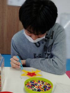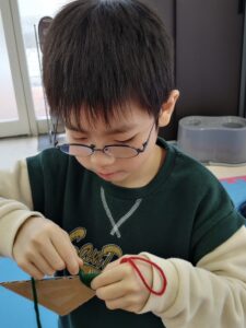 ツリーの飾りには、アイロンビーズや毛糸をぐるぐる巻いて作った オーナメントを