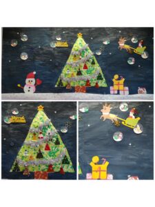 背景の空は絵の具で優しく塗って、壁面全体が一気にクリスマスの雰囲気に