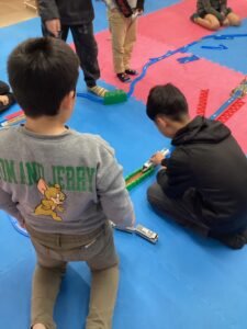 それぞれ自分の好きなパーツを繋げていき、 お友達が作った道と合体させながら大きな路線をつくります