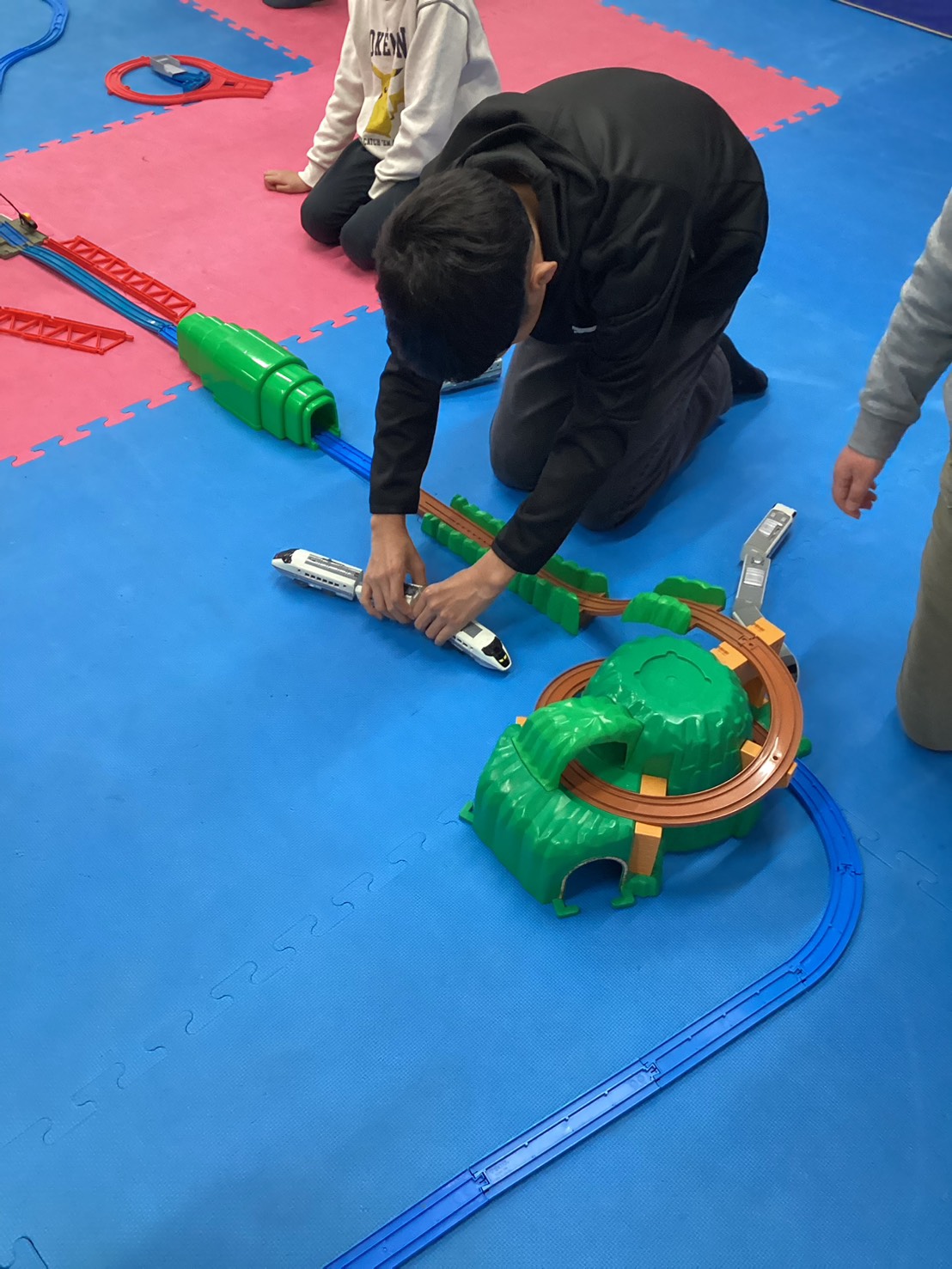 繋げていくなかで、レールをどう組めばスムーズに走るかを考えたり 全体を見てどこを繋いだら1周回るかなども考えていました