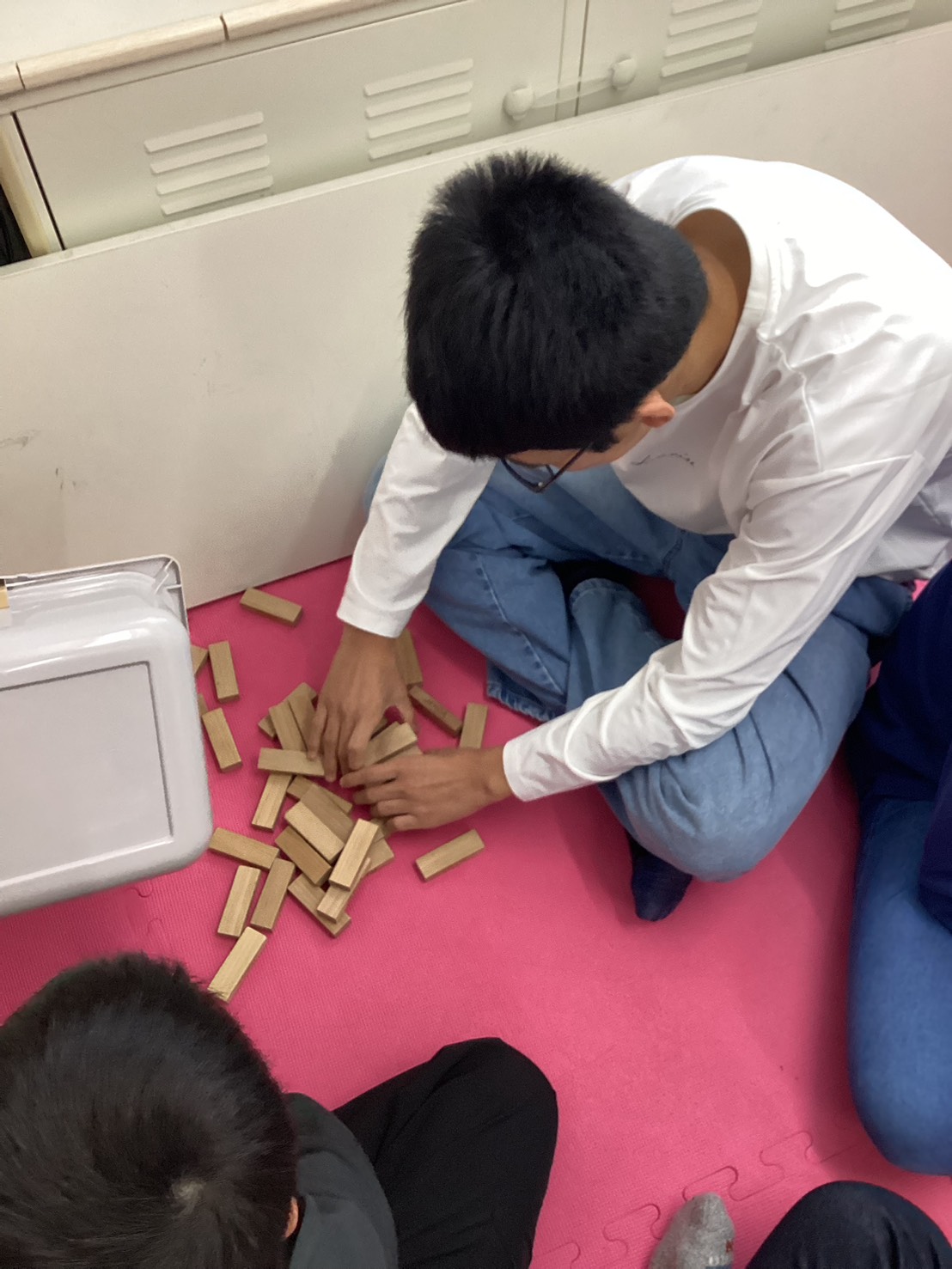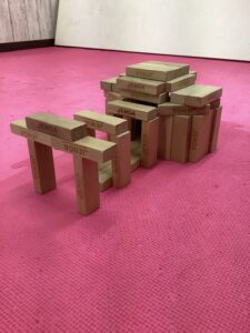 長田校ではジェンガのブロックを使ってドミノ倒しや、