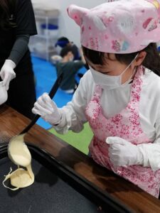 ホットプレートに生地を流して、タイミングを見てひっくり返します。 みんなとても上手で、きれいな丸い形のパンケーキができていました
