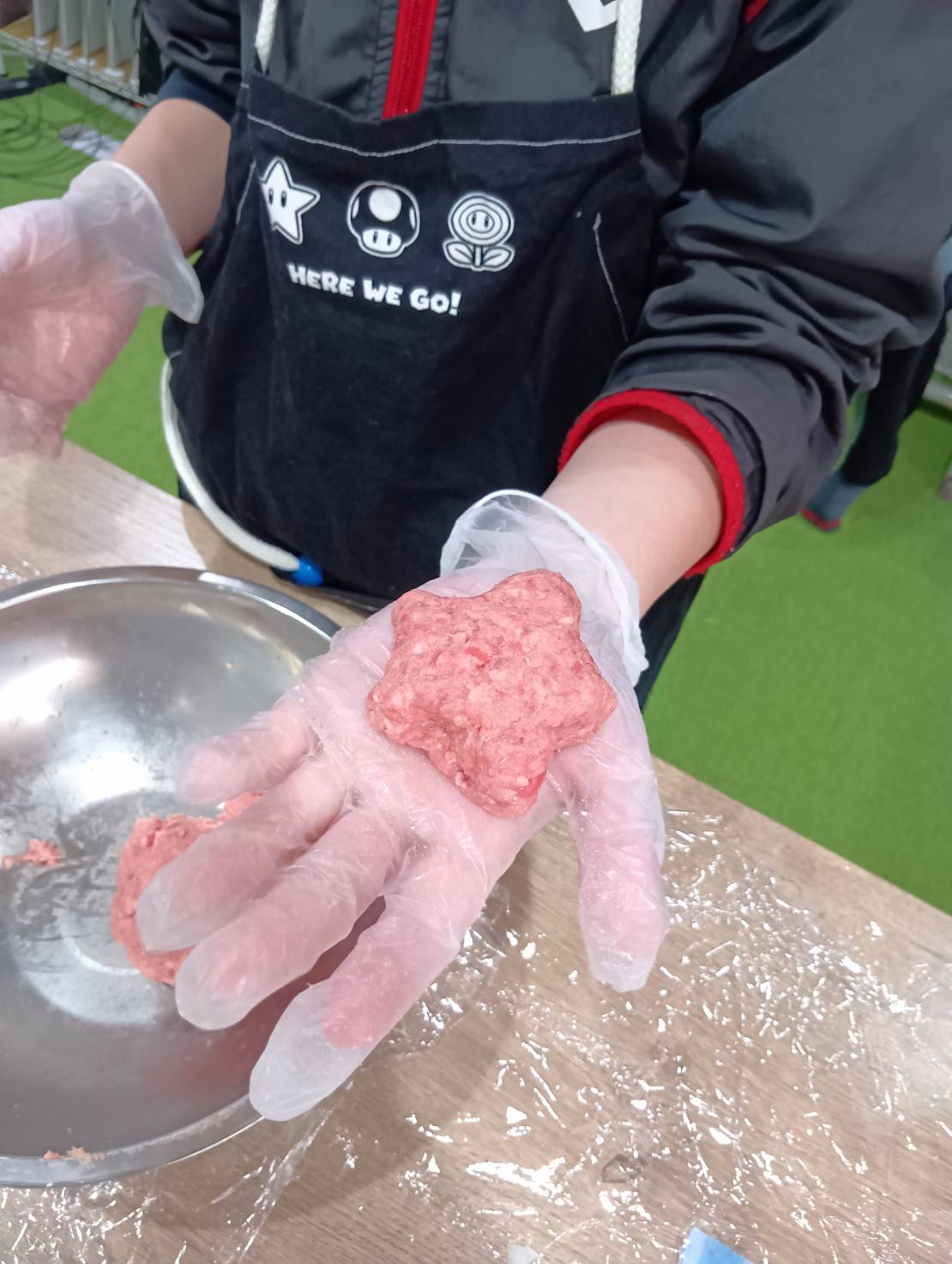 その後はお肉と玉ねぎをしっかり混ぜて、 自分の分のハンバーグ作り!一つの大きなハンバーグにしたり、 小さく分けて作ったり、星の形にしたりと、