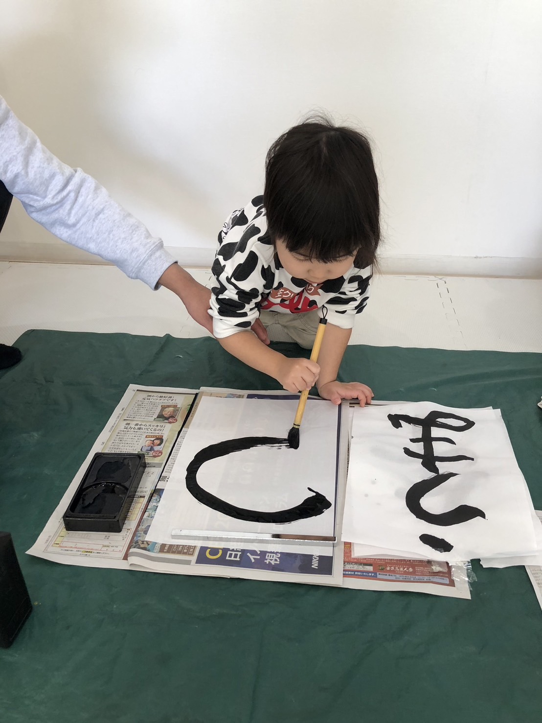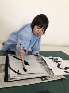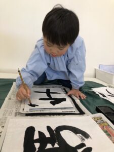 正座をして先生のお手本を真似っこして書いたり、