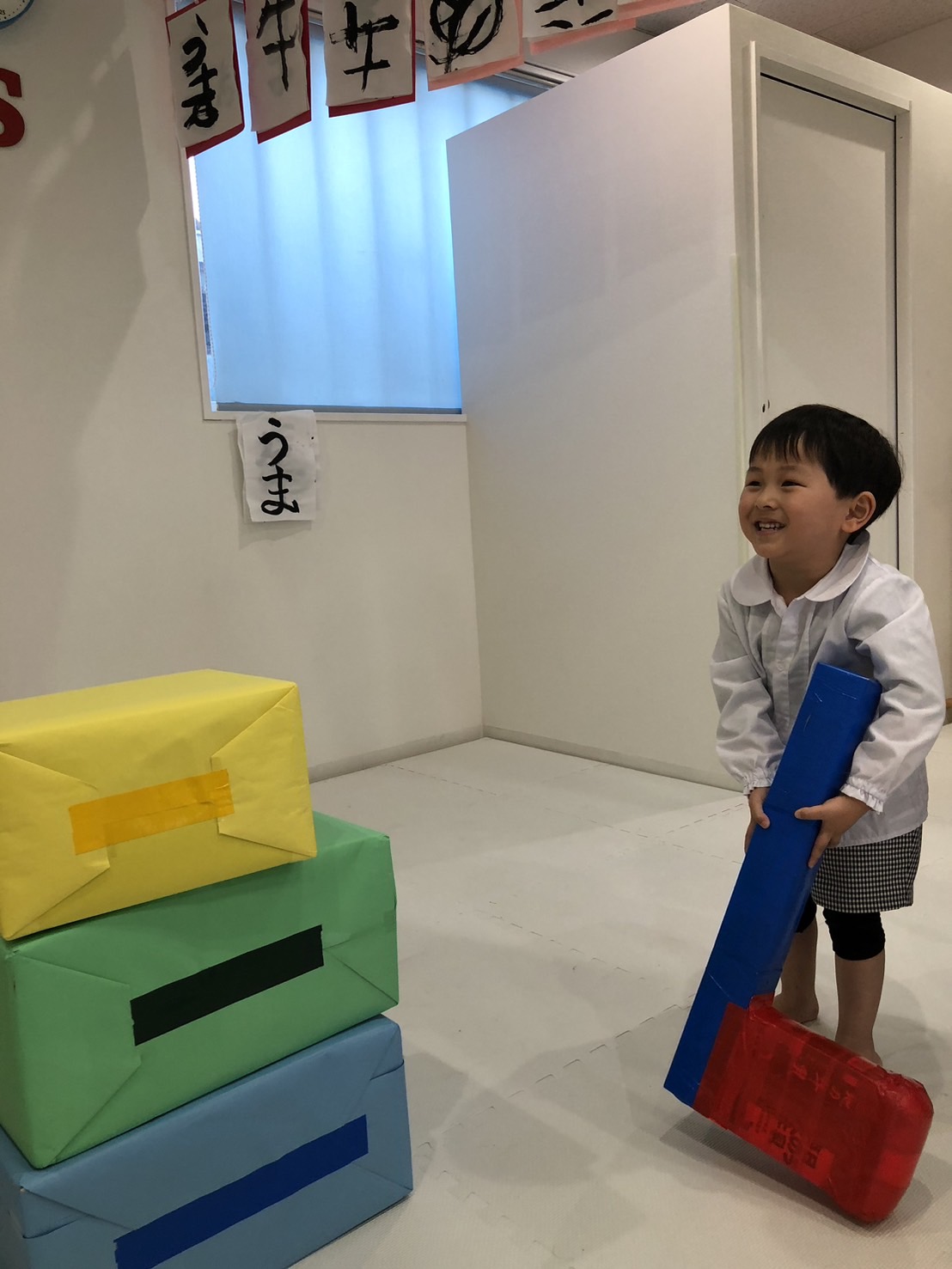 大きいハンマーを振り回して箱を落とすのですが、