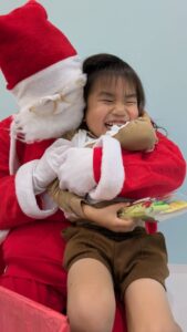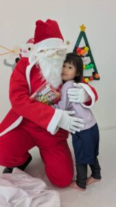 Santa gave yummy snacks The kids carefully put them into their handmade Christmas bags IPPO KIDS also gave a special present—a towel dyed by the children themselves サンタさんからお菓子