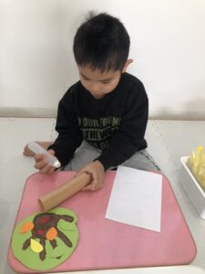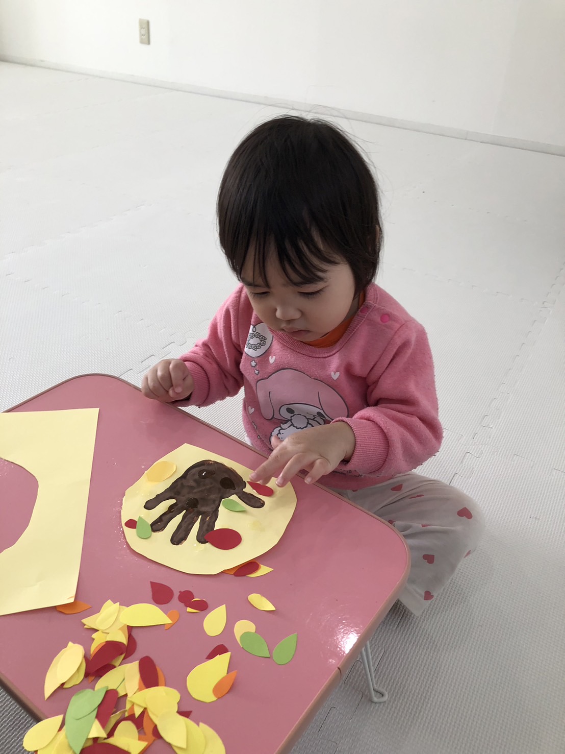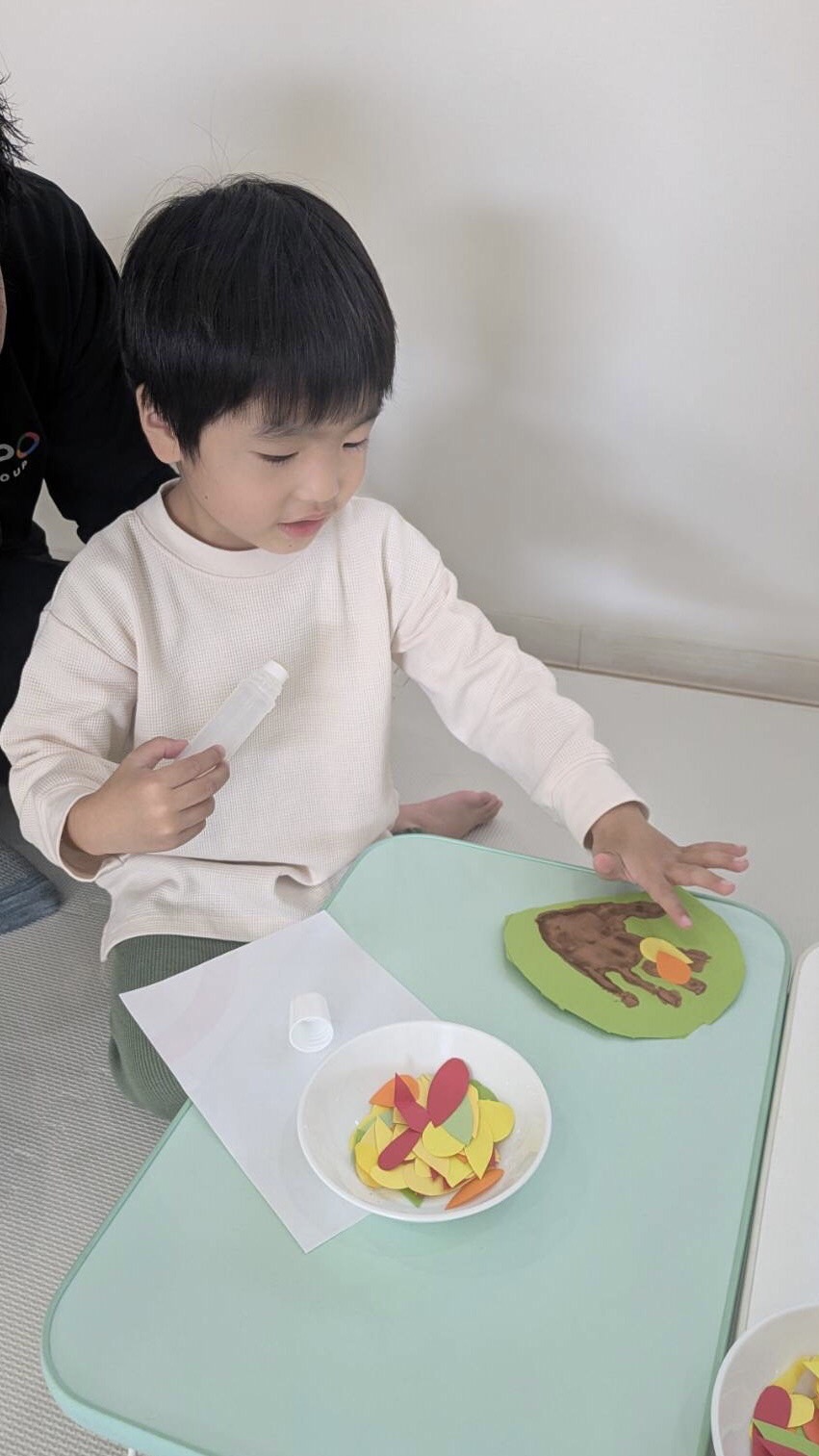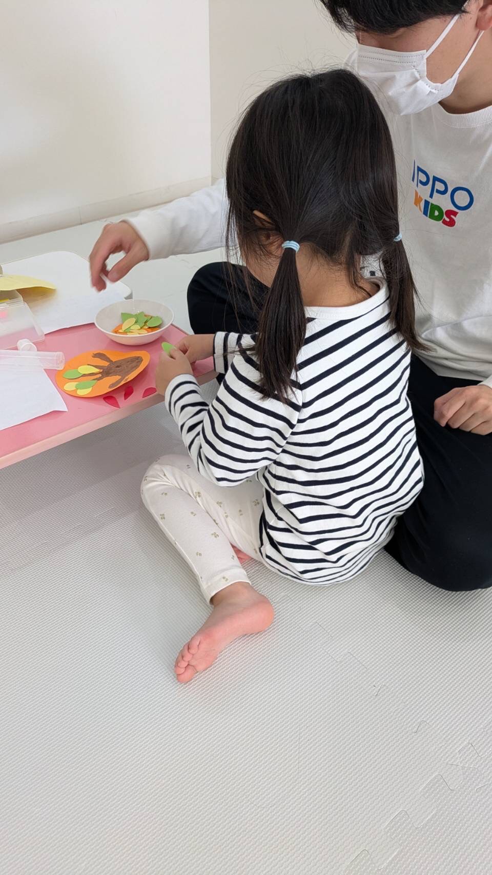 ハサミを使う時も、正しい持ち方で左手を添えて進められるように見ていきます切った後は、色とりどりの小さい葉っぱのパーツをのりでつけていきます