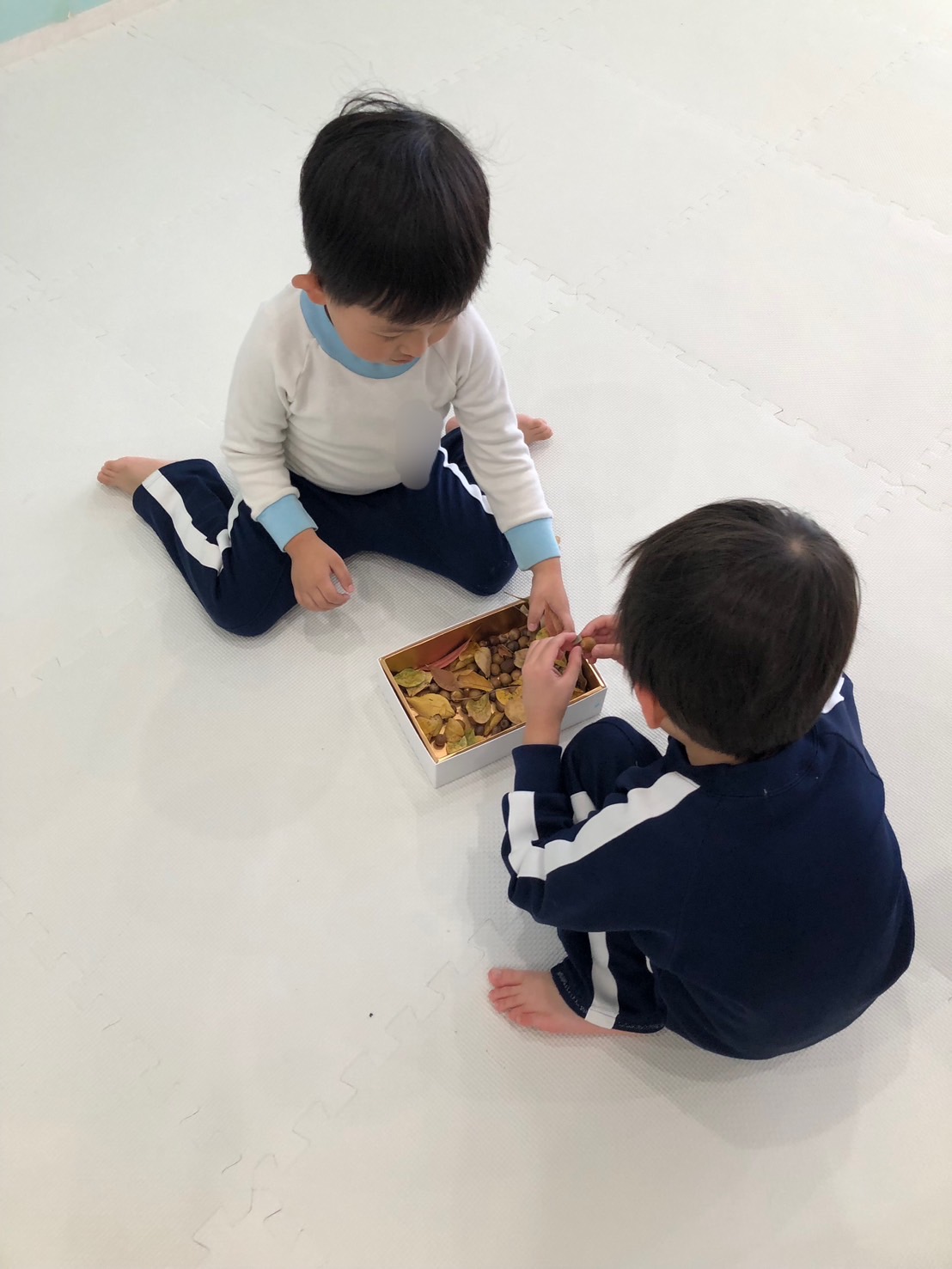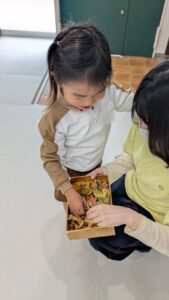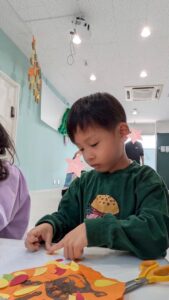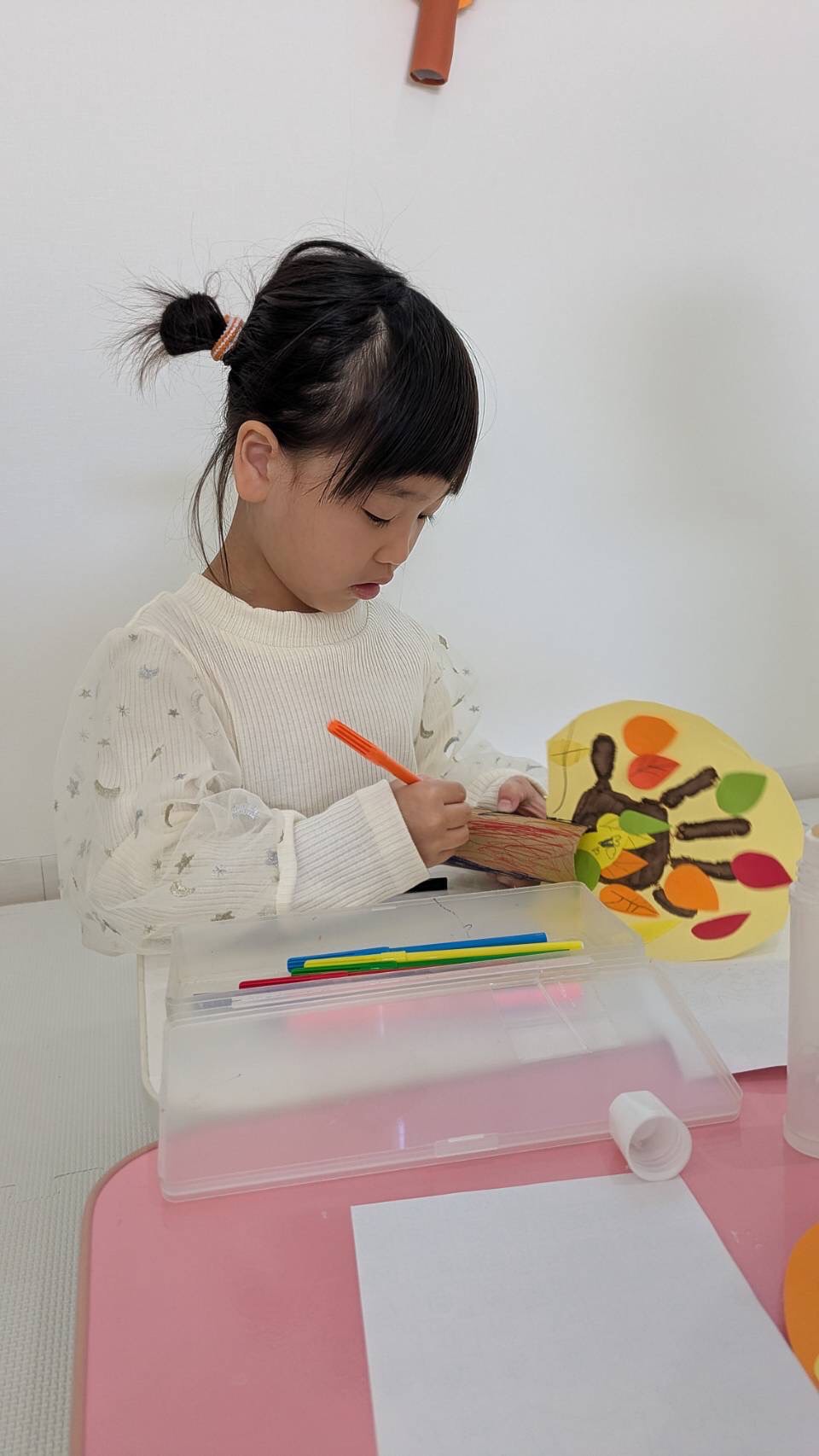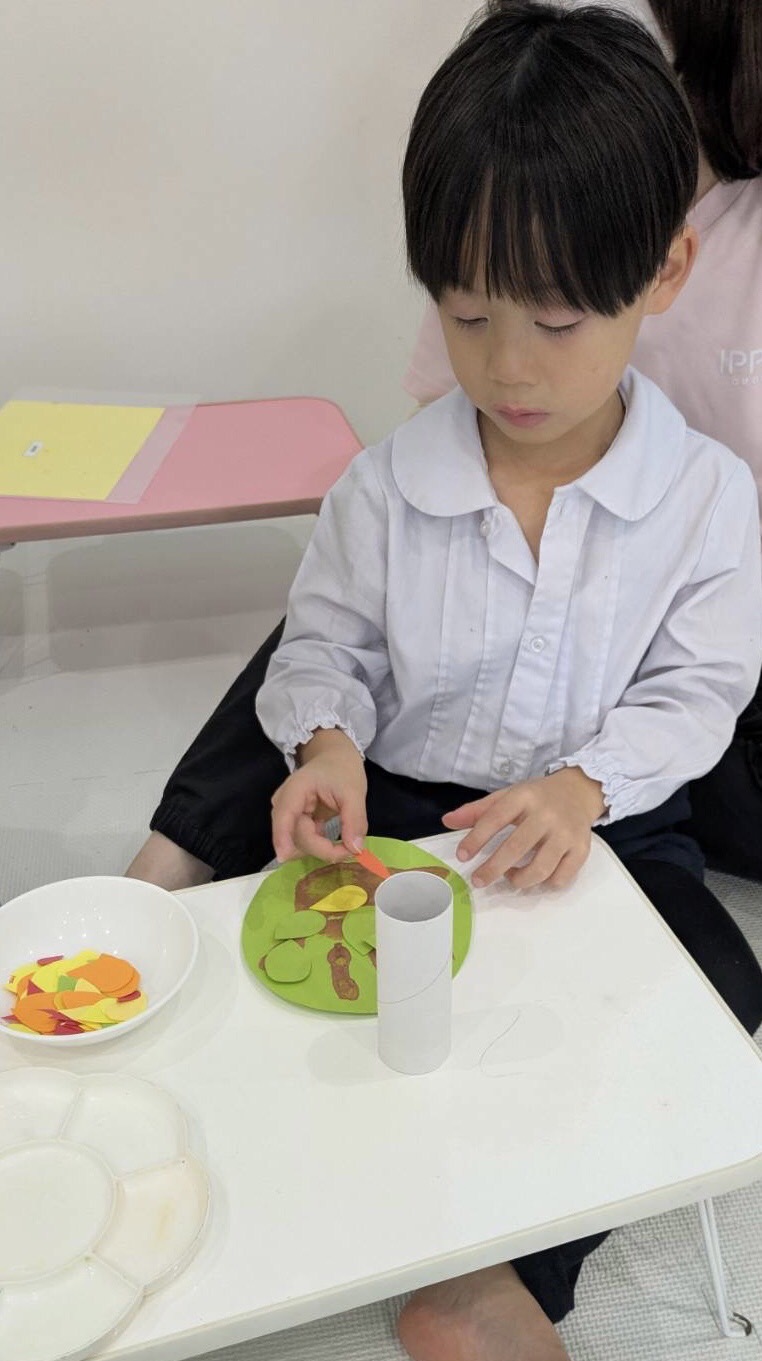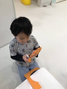 ハサミを使う時も、正しい持ち方で左手を添えて進められるように見ていきます切った後は、色とりどりの小さい葉っぱのパーツをのりでつけていきます